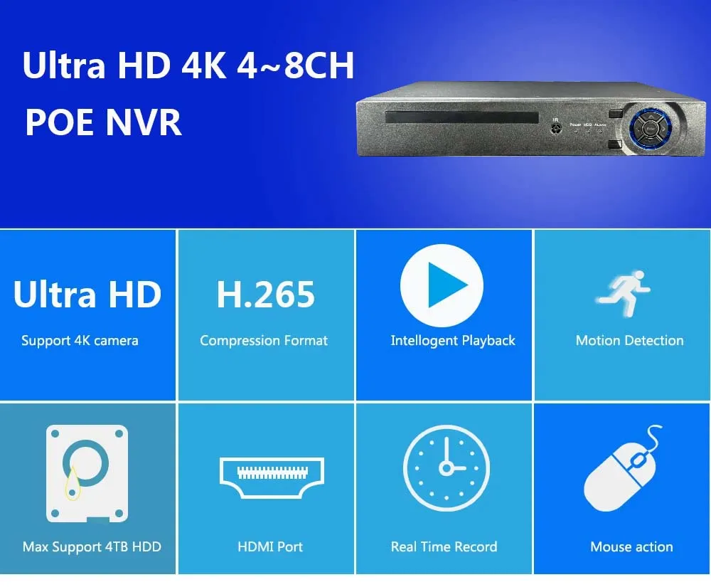 8-Kanal 4K PoE NVR mit 4 PoE-Ports, Videorekorder ONVIF