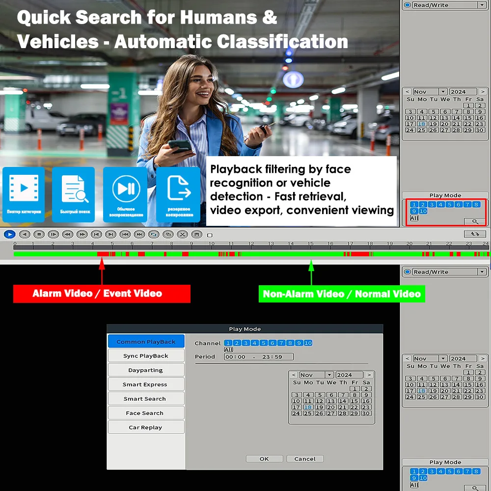 D’après l’explication ci-dessus, si votre caméra prend en charge la détection des visages et des véhicules sous le protocole NETIP, le système listera automatiquement les vidéos des alarmes de visage et de véhicule déclenchées afin que vous puissiez les sélectionner lors de la lecture.